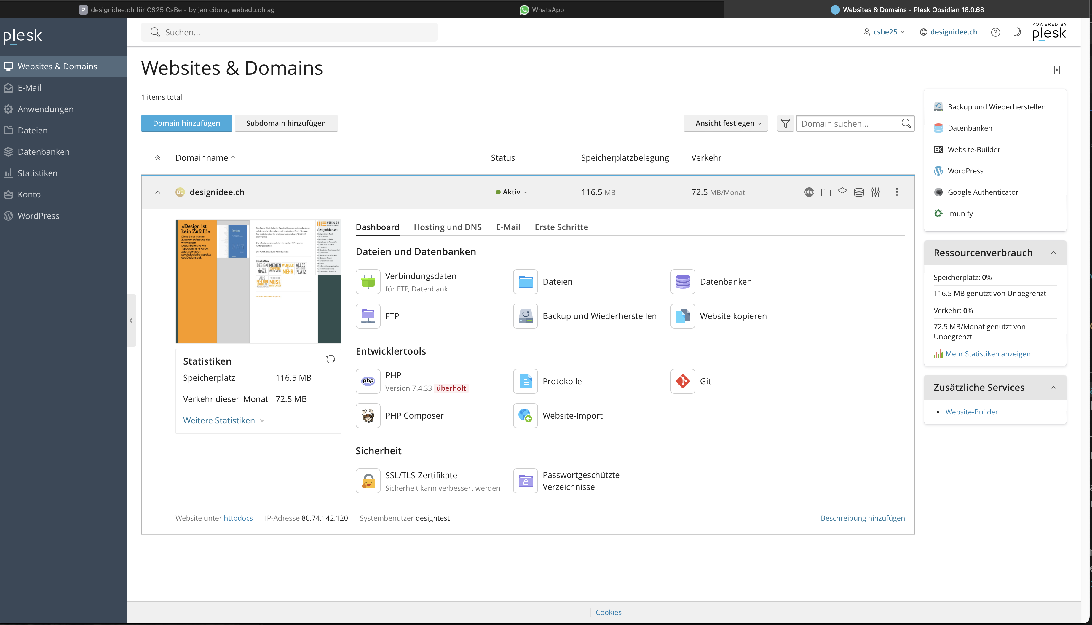 Über ein Administrationspanel (Plesk) werden Domains verwaltet und eingerichtet, Mailadressen erstellt und Datenbanken konfiguriert.