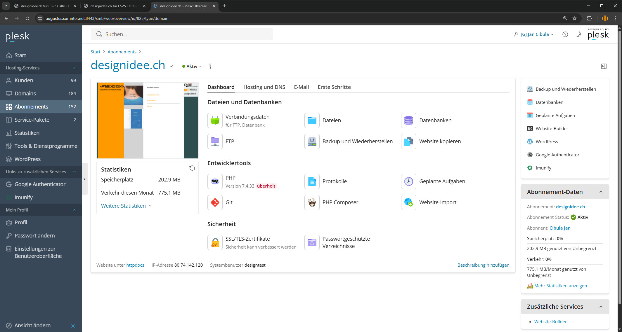 Plesk: Jede Website liegt auf einem Hosting-Provider. Dazu existiert immer ein Login zu einem Administrationssystem. Plesk-Admin von designidee.ch